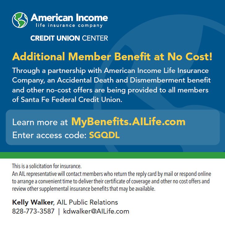Through our partnership with American Income Life Insurance, we provide an AD&D benefit for all members of Santa Fe FCU. Please reach out to them for questions on your policy or to increase your benefits at 828-773-3587.